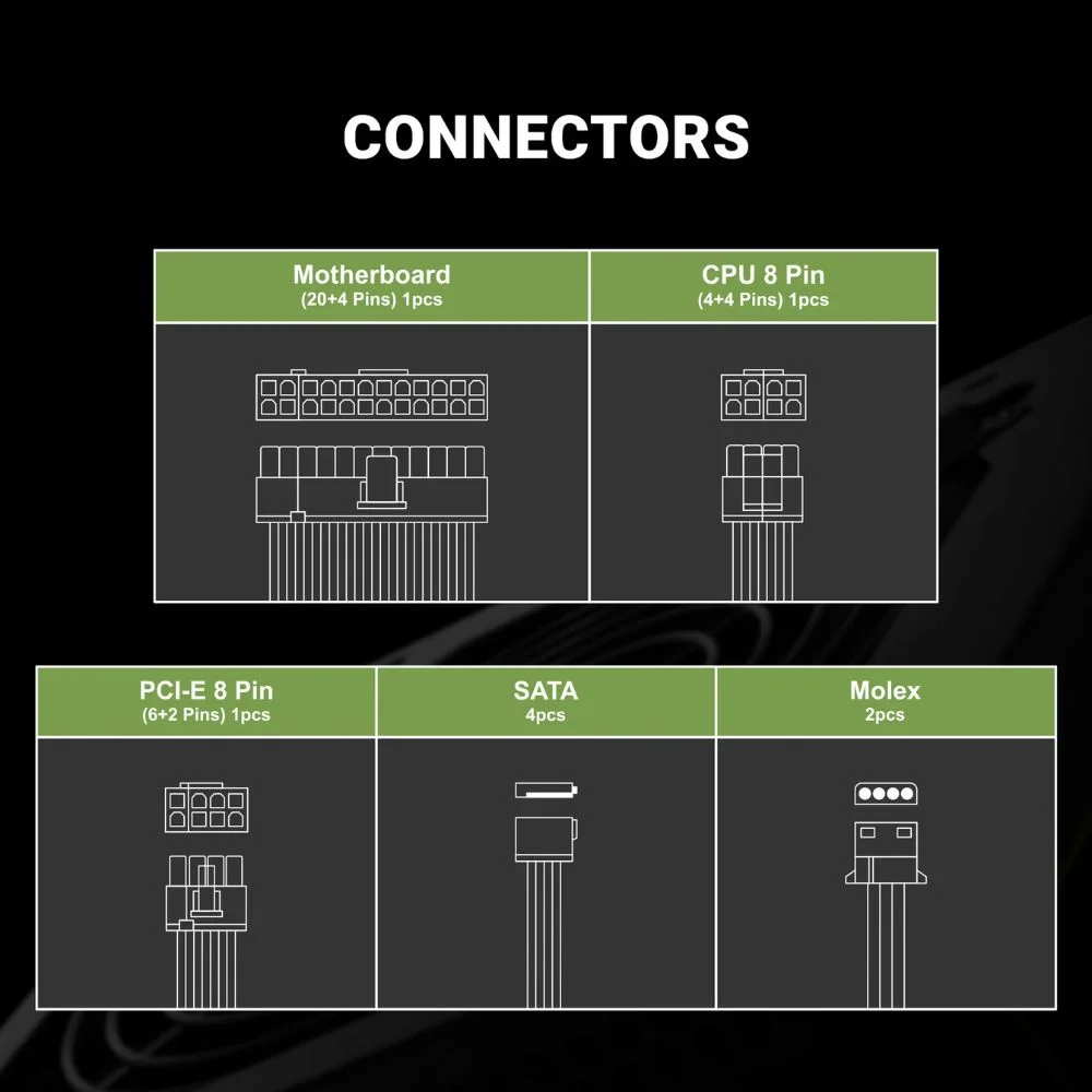 Compatible Connectors – Featuring a versatile range of connectors, including an ATX 24-pin, 4+4 Pin EPS (CPU), 6+2 Pin PCIe, 4 SATA, and 2 Molex connectors, this gaming PSU easily powers various components. Thanks to these options, setting up a gaming system or upgrading existing parts becomes seamless, ensuring compatibility across different hardware configurations for stress-free installation.
