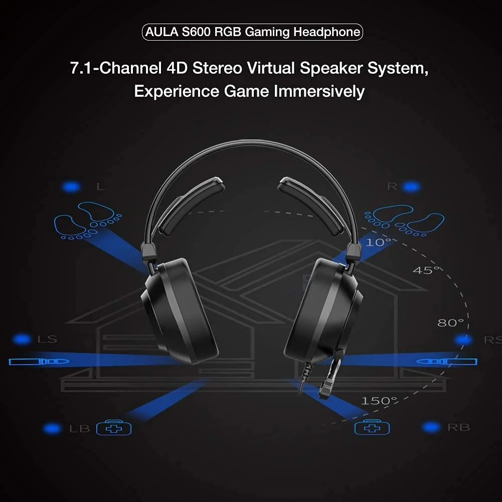 Aula S600 Professional Gaming Headphone USB 7.1, Lightweight Over-Ear Headphone with RGB Light | Soft Foam Earmuffs & HD Noise Cancelling, 360° Rotation Omnidirectional Mic for Desktop & PC Gamers (Black)