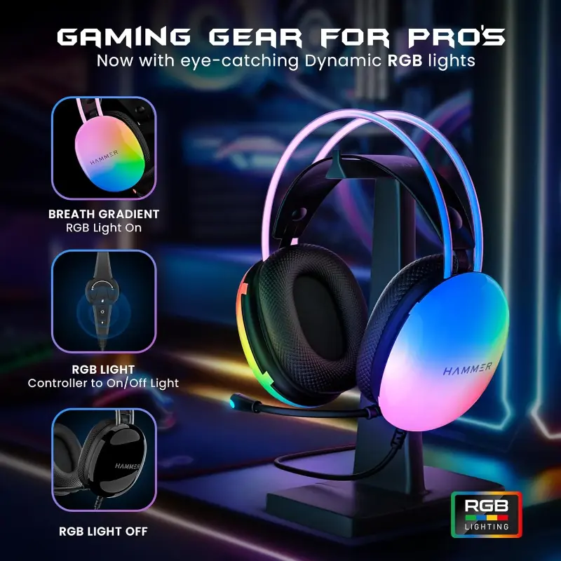 Experience immersive audio and stylish lighting with the HAMMER Blaze wired over-ear gaming headset. Designed for gamers, streamers, and everyday users alike, this headset delivers powerful sound, clear voice communication, and eye-catching RGB aesthetics.