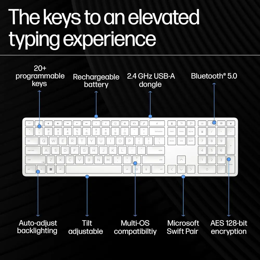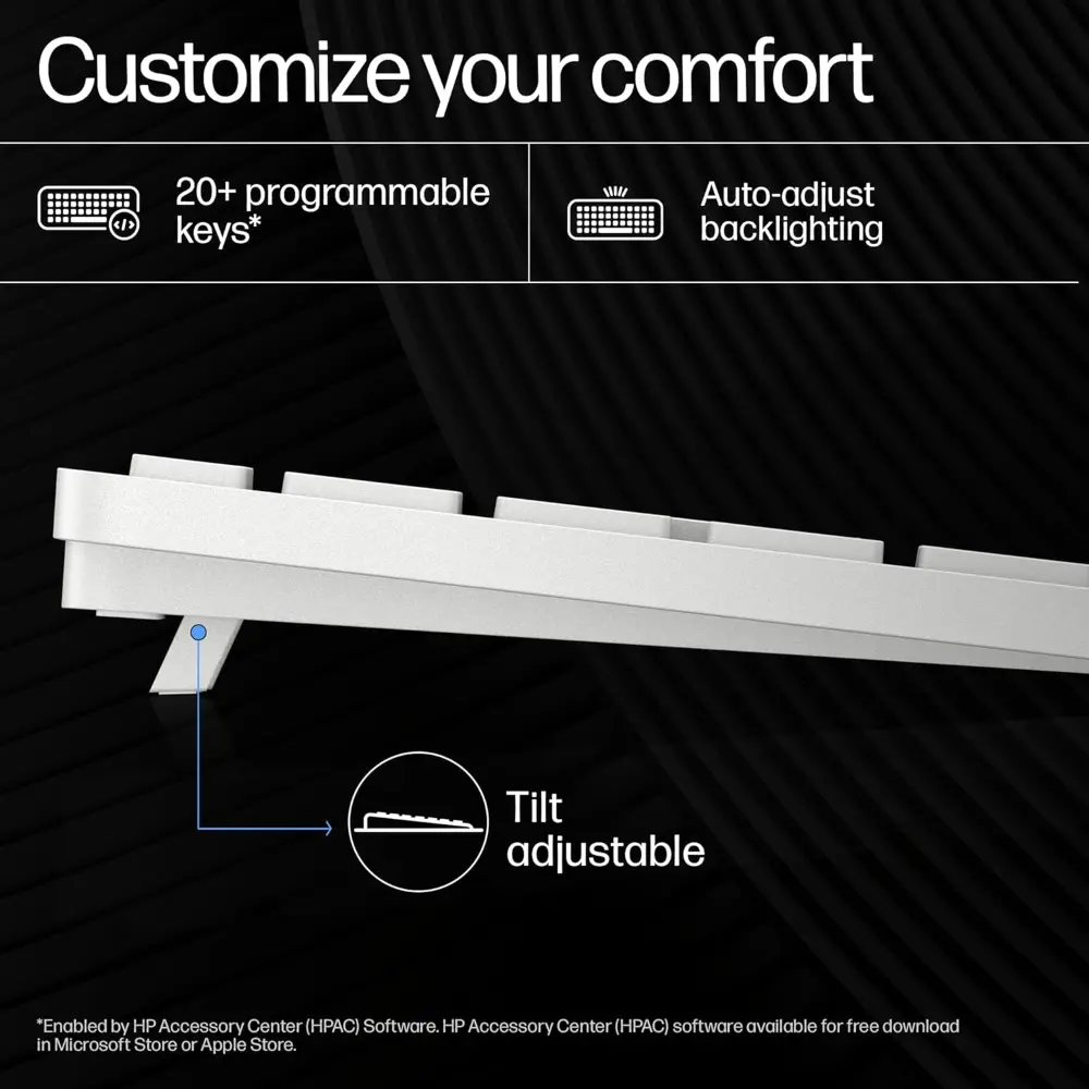 Customizable Keys: Optimize how you work with HP Accessory Center and easily program 20+ keys with shortcuts so you can reduce keystrokes for a faster, smoother typing experience