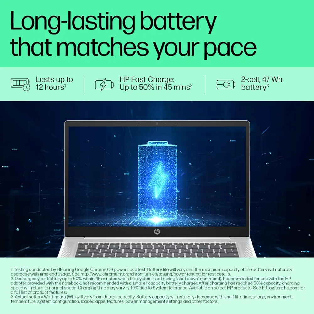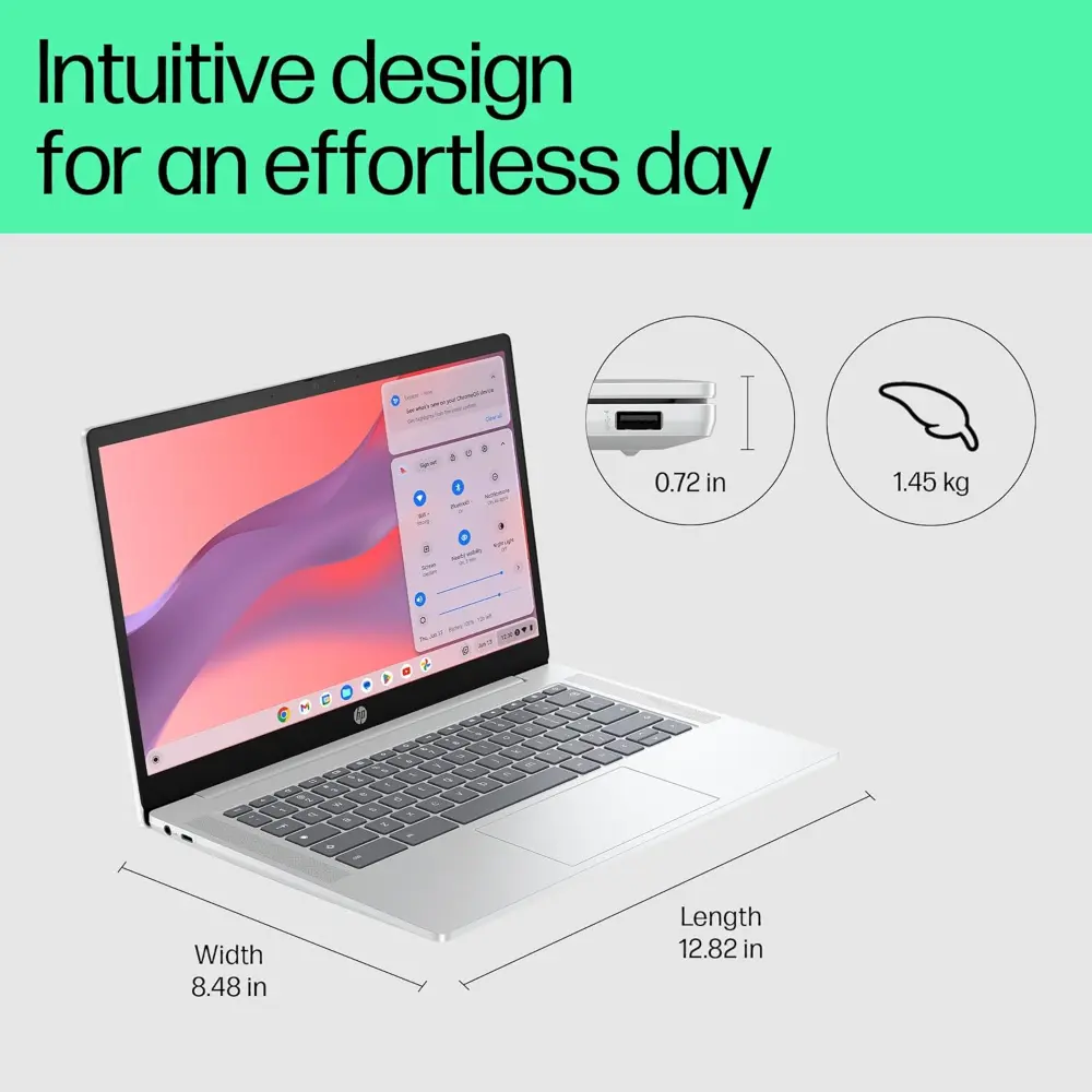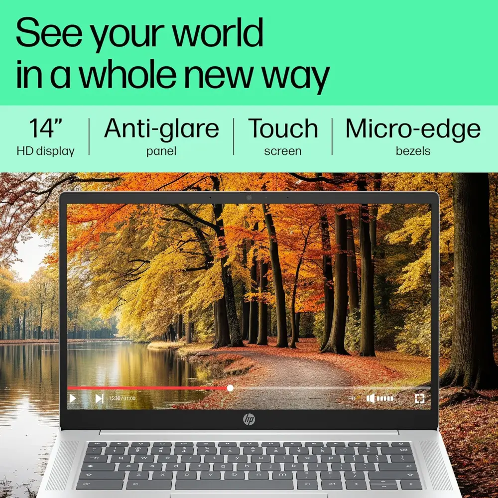 HP Chromebook, Intel Core N200, 8GB LPDDR5, 128GB UFS, 14-inch (35.6cm), Anti-Glare, Touchscreen, HD Laptop, Intel UHD Graphics, 720p HD Camera (Silver, 1.45kg)