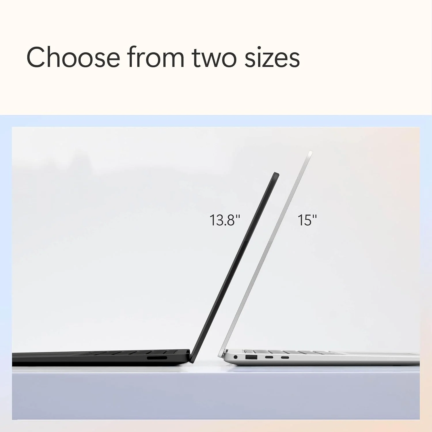 Two sizes, your choice – Sleek 13.8″ for seamless portability, or indulge in the expansive 15″ with added power, extended battery life, and more ports.