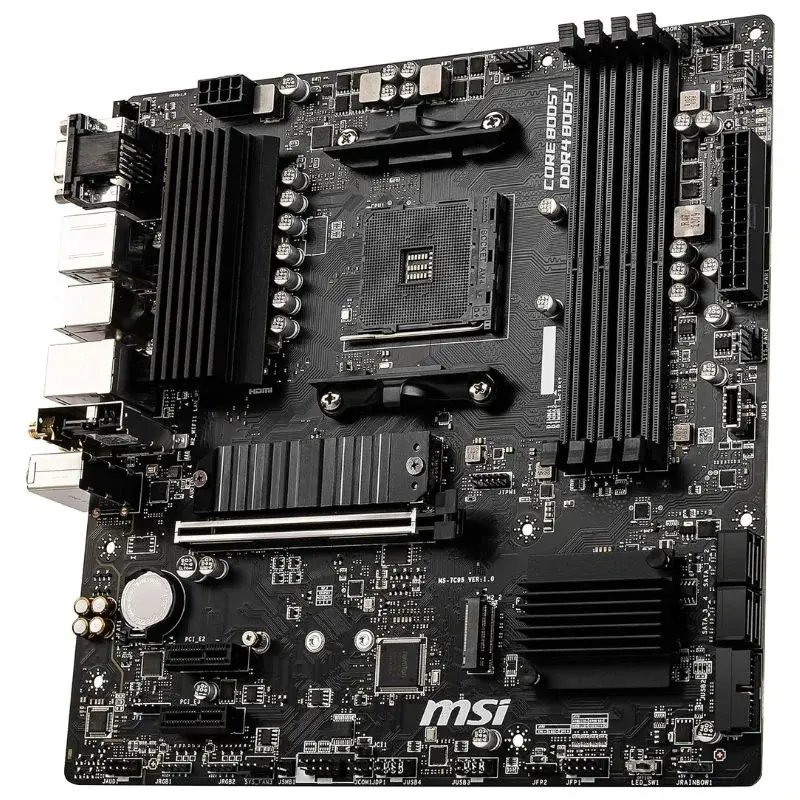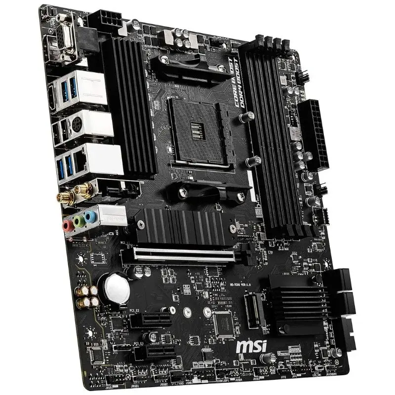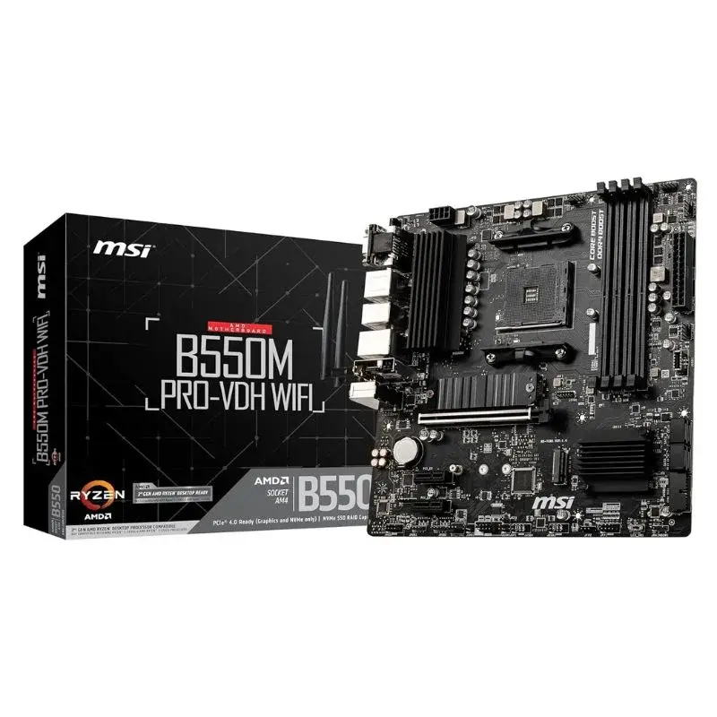 The MSI B550M PRO-VDH WiFi is a reliable and performance-focused Micro-ATX motherboard designed for AMD Ryzen 5000, 4000, and 3000 series desktop processors. Featuring PCIe 4.0, dual M.2 slots, and high-speed USB 3.2 Gen1 Type-C, it ensures smooth multitasking, gaming, and content creation. With built-in Wi-Fi, Gigabit LAN, and premium thermal solutions like M.2 Shield Frozr, this board provides stability, speed, and connectivity for modern PC builds.