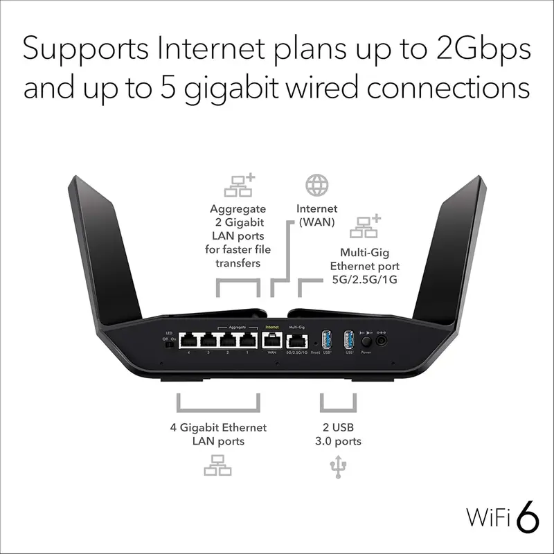 Supports Multi-Gig Internet up to 2Gbps – RAX120 is one of the first routers to support a WAN port to deliver more than one gigabit of Internet speed to your WiFi devices. Requires compatible fiber or cable modem supporting Multi-Gig internet speeds (sold separately).
