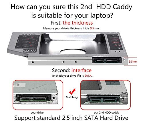 Compatible 2.5 Inch, 9.5mm SATA HDD or SSD, Hard drive NOT include.100% Brand New 9.5 mm-thick caddy.