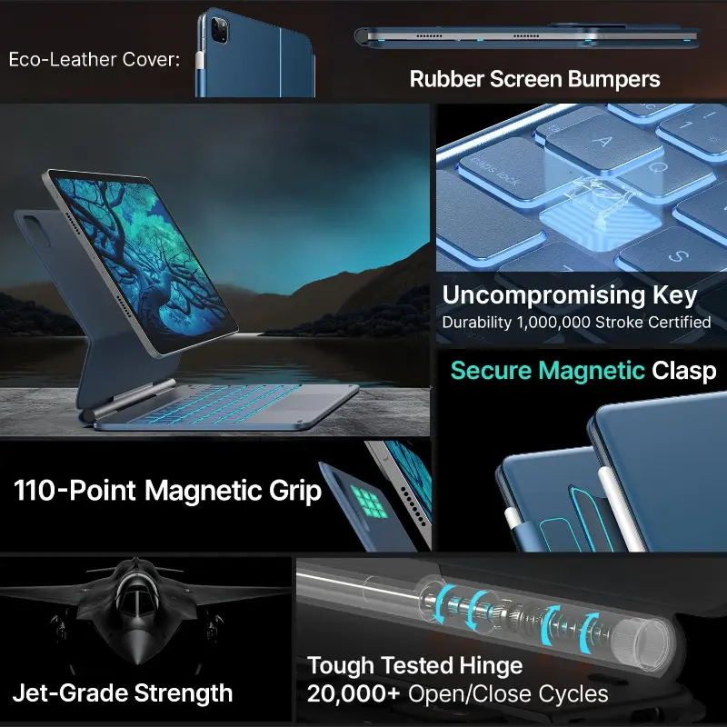 Click Anywhere: Elevate your iPad experience with our precise, versatile keyboard. Effortlessly navigate work and play with a full-area trackpad.