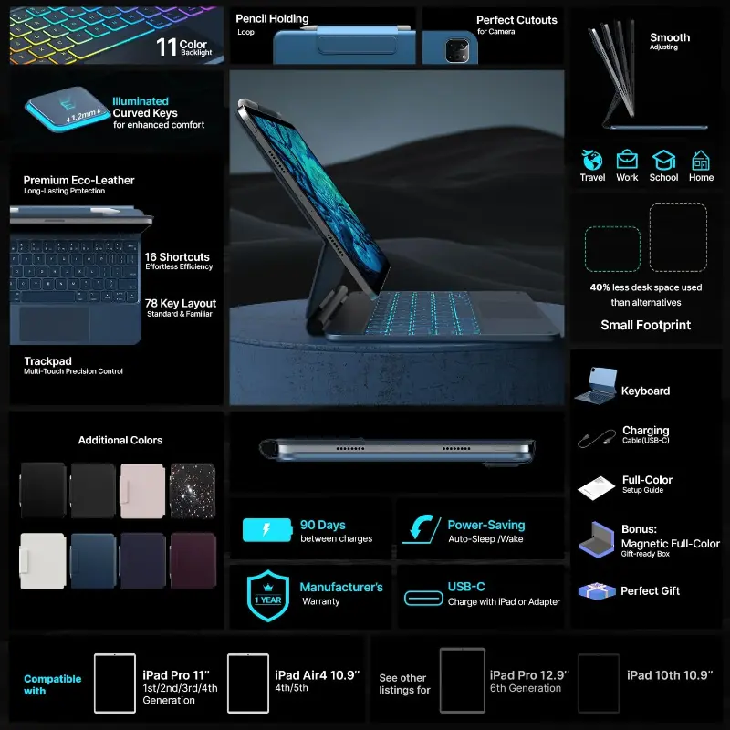 Compatibility: Magic Keyboard Compatible for iPad Air 11-inch (M3 2025 / 2024 M2) & iPad Pro 11-inch 4th/3rd/2nd/1st gen (2018-2022) , iPad Air 5th/Air 4th. Models include iPad Air 11-inch (M3 2025) Air 11 inch M2 2024 (A2902, A2903, A2904),2022 Pro 11 4th Generation (A2759, A2435, A2761, A2762) 2021 Pro 11 3rd Generation (A2377, A2301, A2459, A2460), 2020 Pro 11 2nd Generation (A2228, A2068, A2230, A2231), 2018 Pro 11 1st Generation (A1980, A2013, A1934, A1979), 2022 10.9-inch Air 5th Generation(A2588, A2589, A2591) 2020 10.9-inch Air 4th Gen (A2072, A2316, A2324, A2325) ** NOT FIT FOR IPAD PRO 11(M4) 2024 **