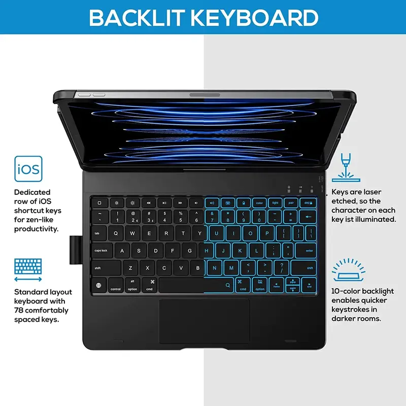 Precision Trackpad – The iPad Air 11 & iPad Pro 11 inch keyboard case has a unique design with high precision Trackpad, navigate your iPad Air 11 & iPad Pro 11 in a whole new way with your fingers. Edit documents, browse the web, and build presentations with unparalleled speed, bringing you the convenience of high productivity.