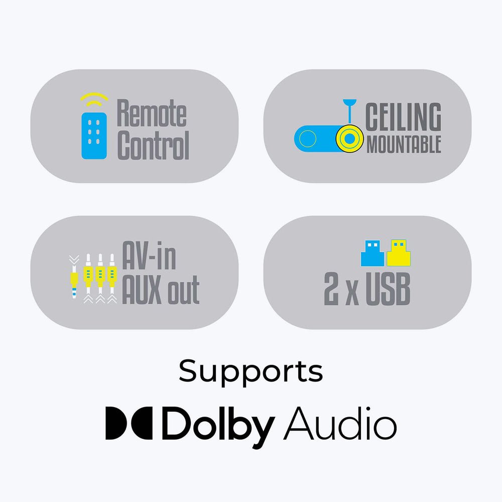 Dolby Audio Setup – This ceiling-mountable projector offers an exceptional audio-visual experience and is equipped with Dolby Audio, allowing for immersive sound that enhances your viewing experience. Beyond its impressive audio capabilities, the projector also features versatile connectivity options, including AV IN, AUX Out, and dual USB ports, making it easy to connect a variety of devices. It also comes with a convenient remote control for effortless operation.